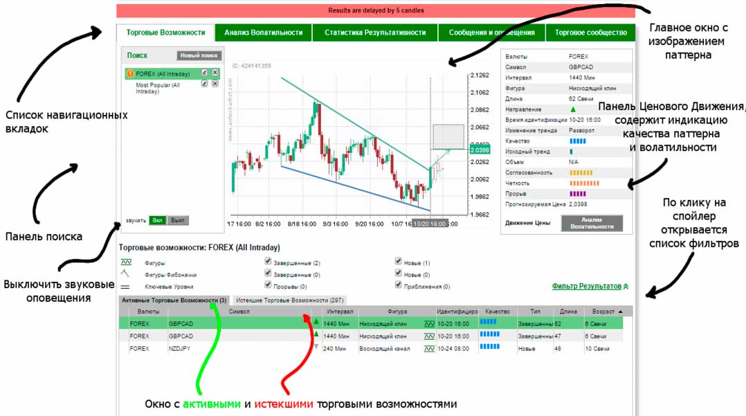 Всегда открыта вкладка «существующие возможности для торговли», на ней обозначены паттерны в процессе формирования, по которым прямо сейчас можно входить в рынок, их качество, название, конкретная валютная пара.