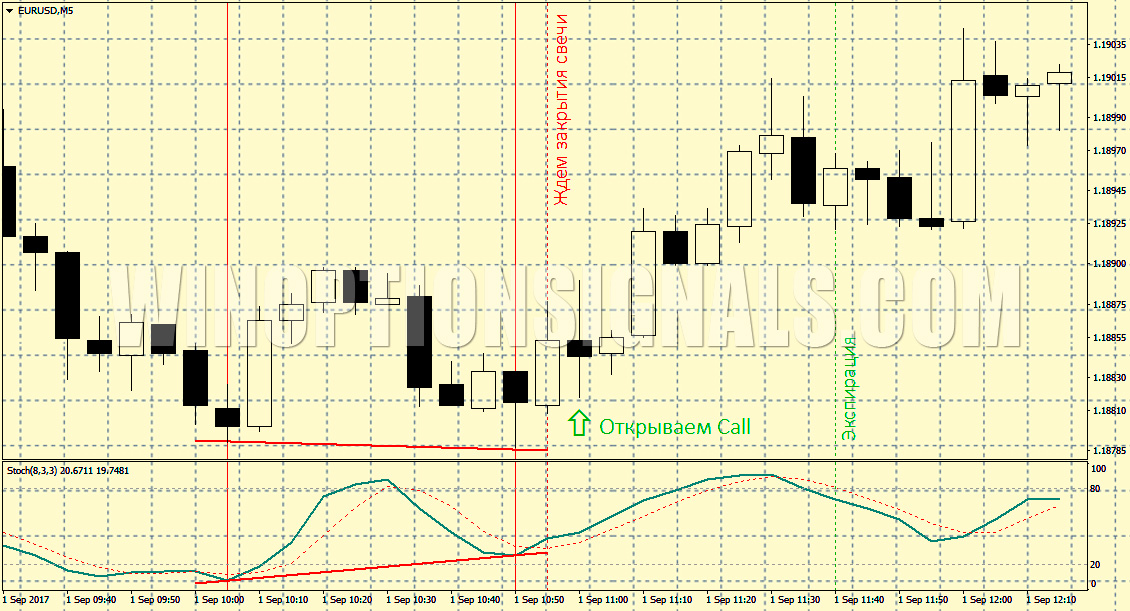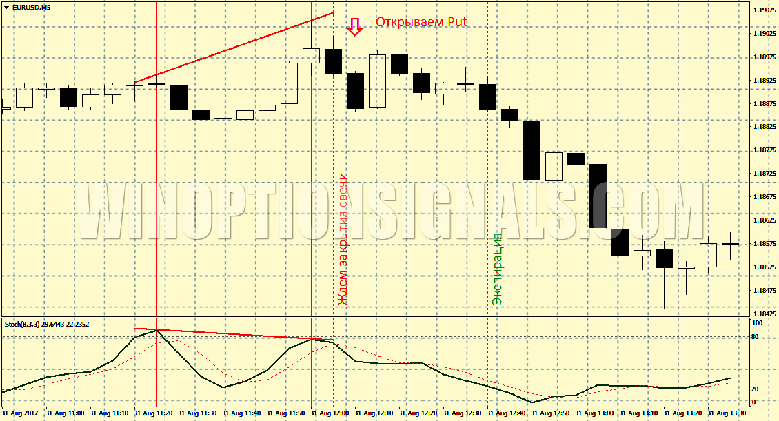 Следовательно, принимать решение о покупке опциона можно только после того, как будет закрыта крайняя свеча, а на индикаторе и графике образуются совпадающие экстремумы.