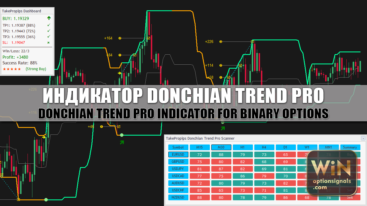 The Donchian Trend Pro indicator is a paid channel indicator for binary options and the Forex market , which is based on the popular Donchian channel indicator, but the TakeProPips Donchian Trend Pro indicator has improved new functionality, thanks to which it is possible to enter a trade much more accurately using signals, markings price targets and dashboards.