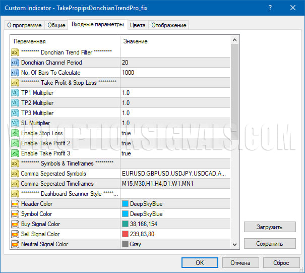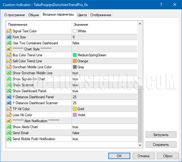 The Donchian Trend Pro indicator has quite a lot of settings, although a considerable part of them are responsible for visual and color indicators: