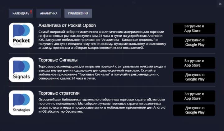 In this case, we are not talking about technical indicators. This menu provides access to quickly switch between the economic calendar , free signals and PocketOption bonuses :