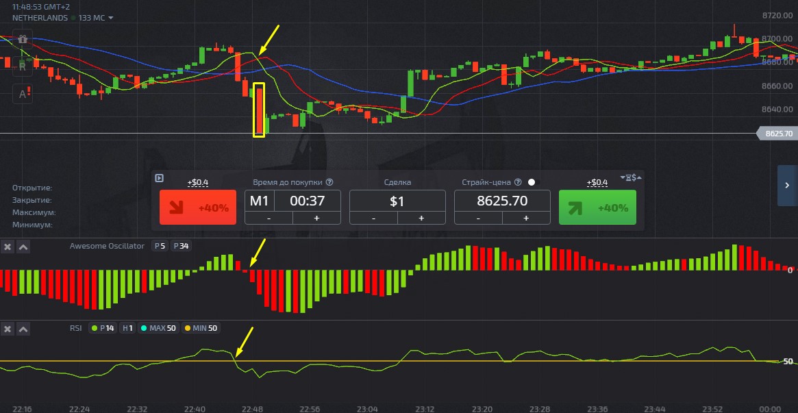 For RSI, you need to set the period to 14 and level 50 for overbought and oversold zones. And in the Awesome Oscillator indicator window you should set periods of 5 and 34.