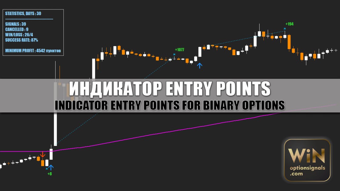 Индикатор для бинарных опционов Entry Points – топовый сигнальный инструмент технического анализа, специально разработанный под платформу MetaTrader 4. По заявлению разработчиков, он дает точные сигналы на открытие и закрытие сделок без перерисовки, ведет статистику своих сигналов, а также подходит для торговли любыми финансовыми инструментами.