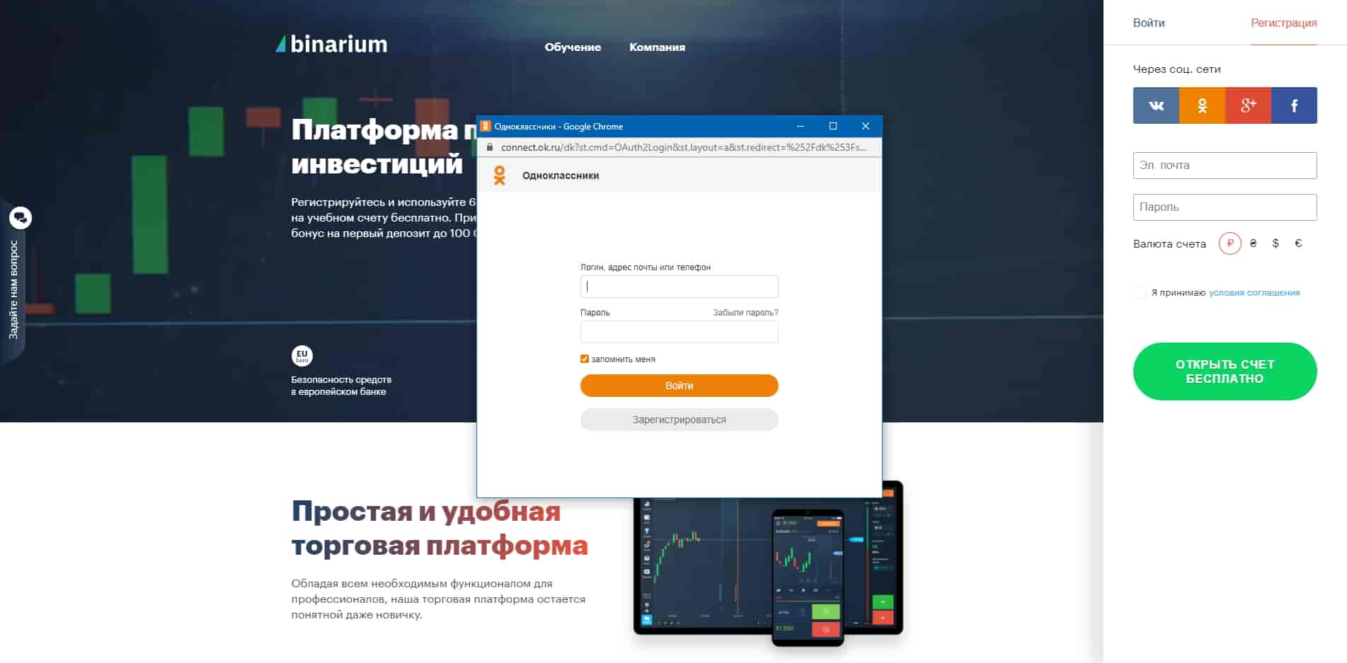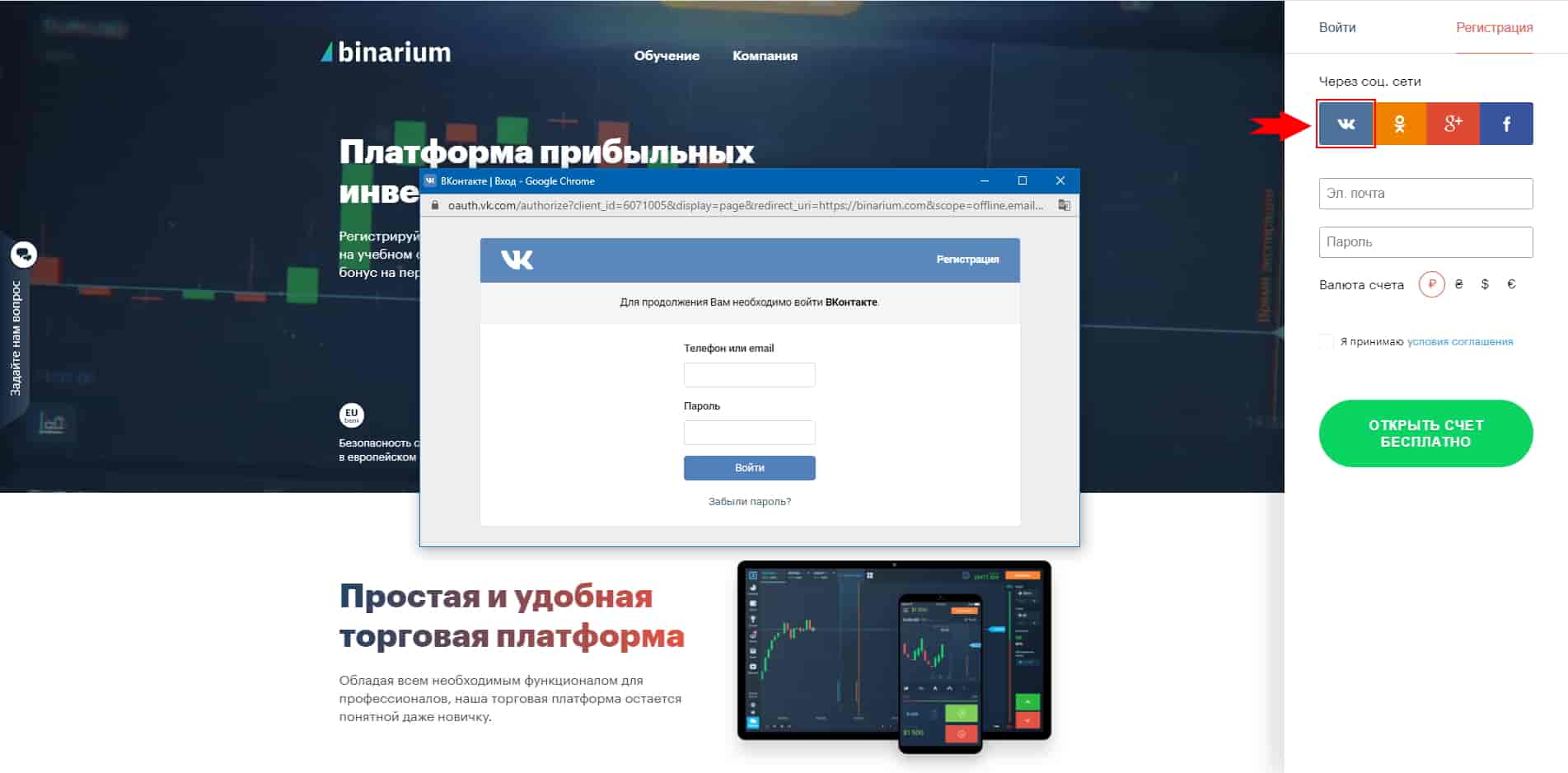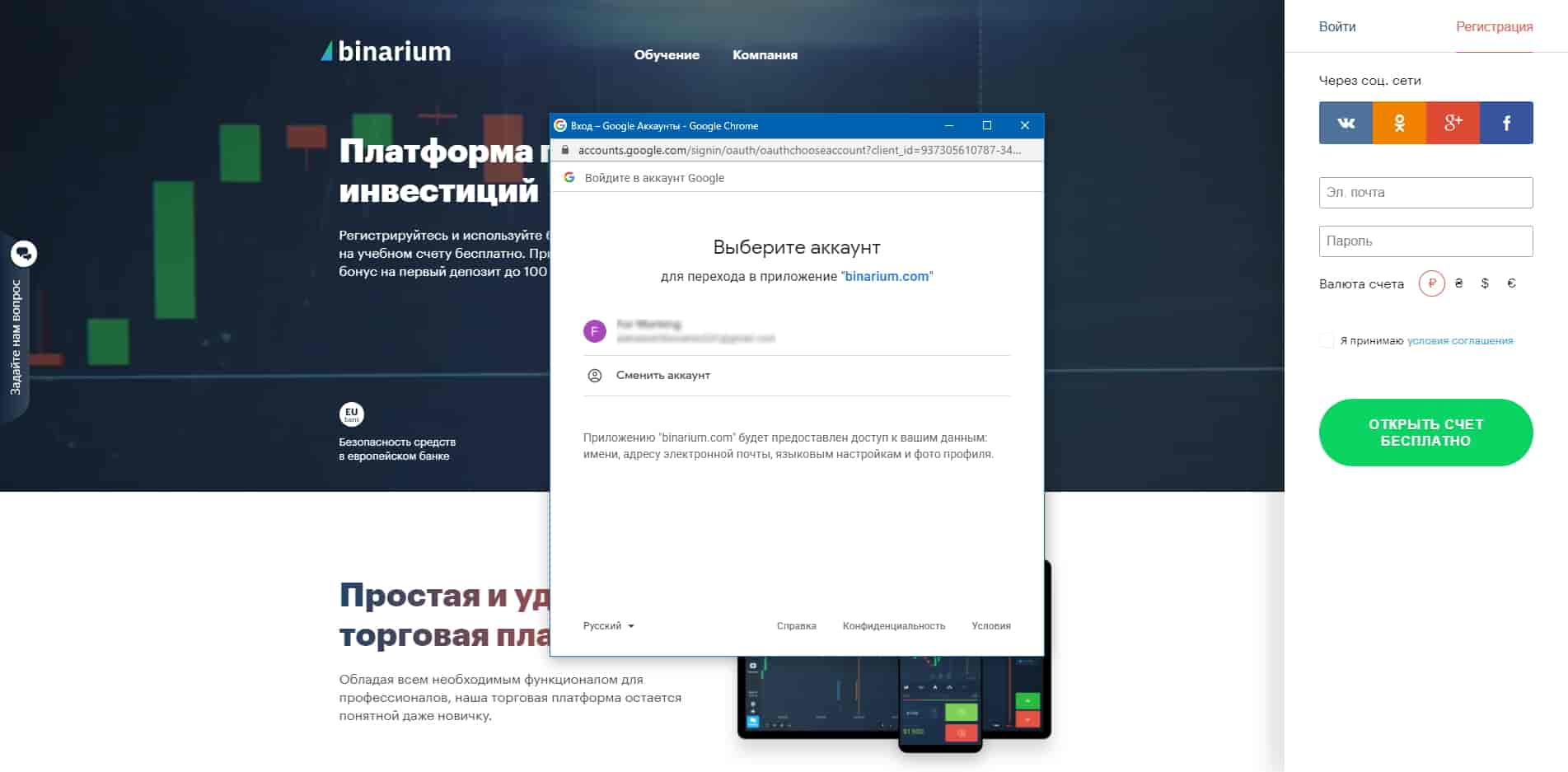 En la plataforma Binarium, el registro se puede acelerar utilizando una cuenta en una de las cuatro redes sociales: