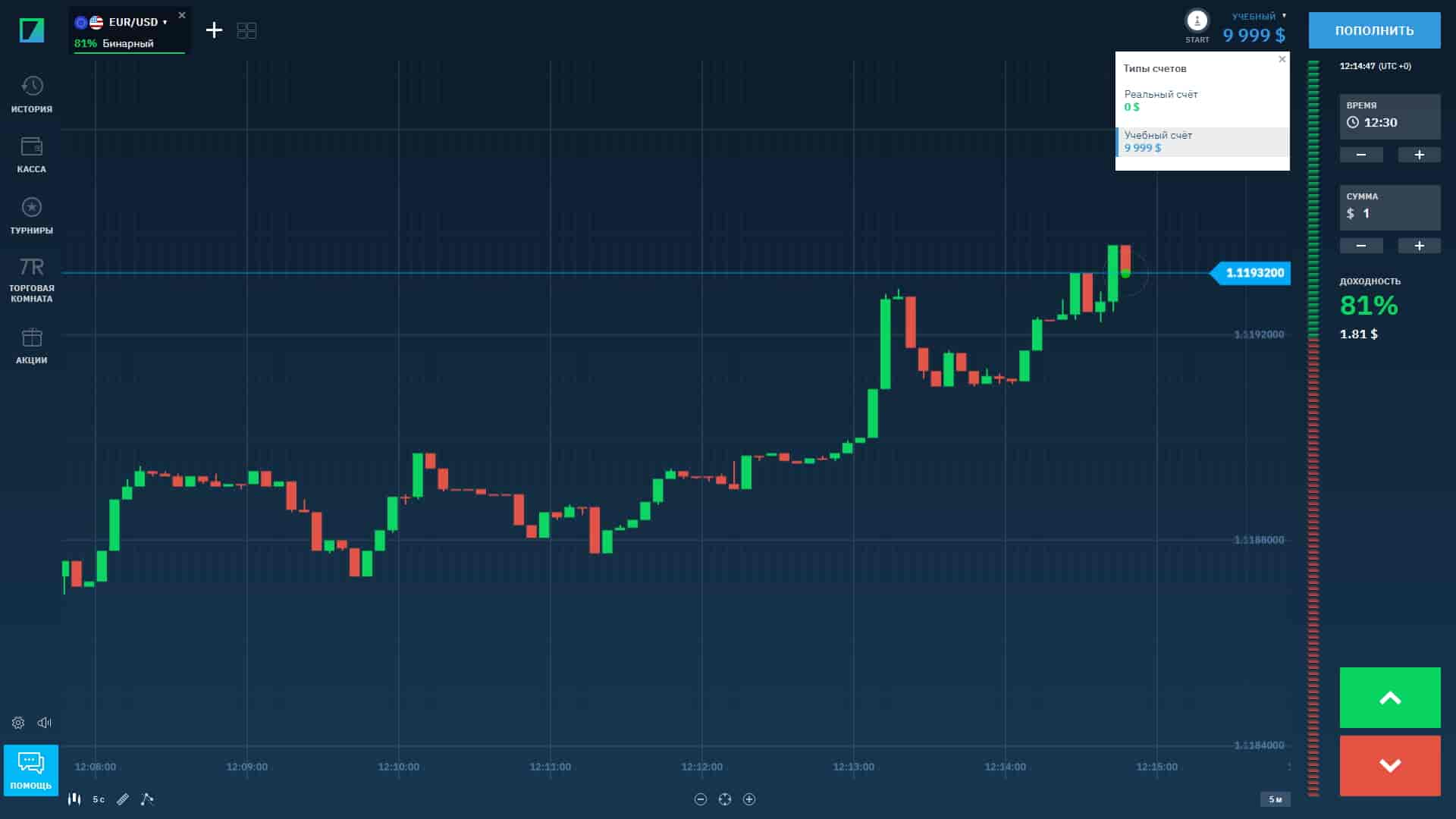 Para empezar a operar con opciones binarias, simplemente haga clic en el botón del mismo nombre. Se abrirá una plataforma de trading con dos tipos de cuenta, que se pueden cambiar con un solo clic.