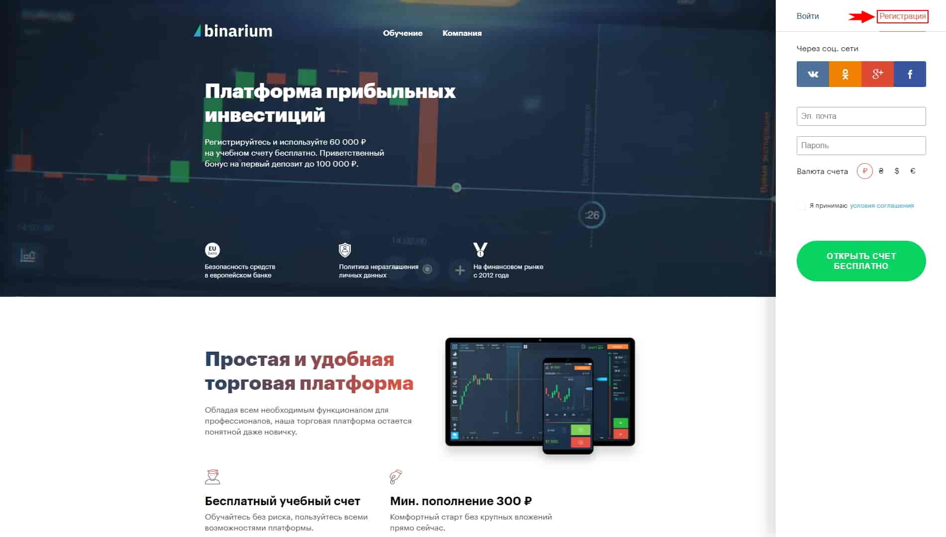 Puedes registrarte en el sitio web del bróker Binarium con solo unos clics. Para ello, abre la página principal y la pestaña del mismo nombre: