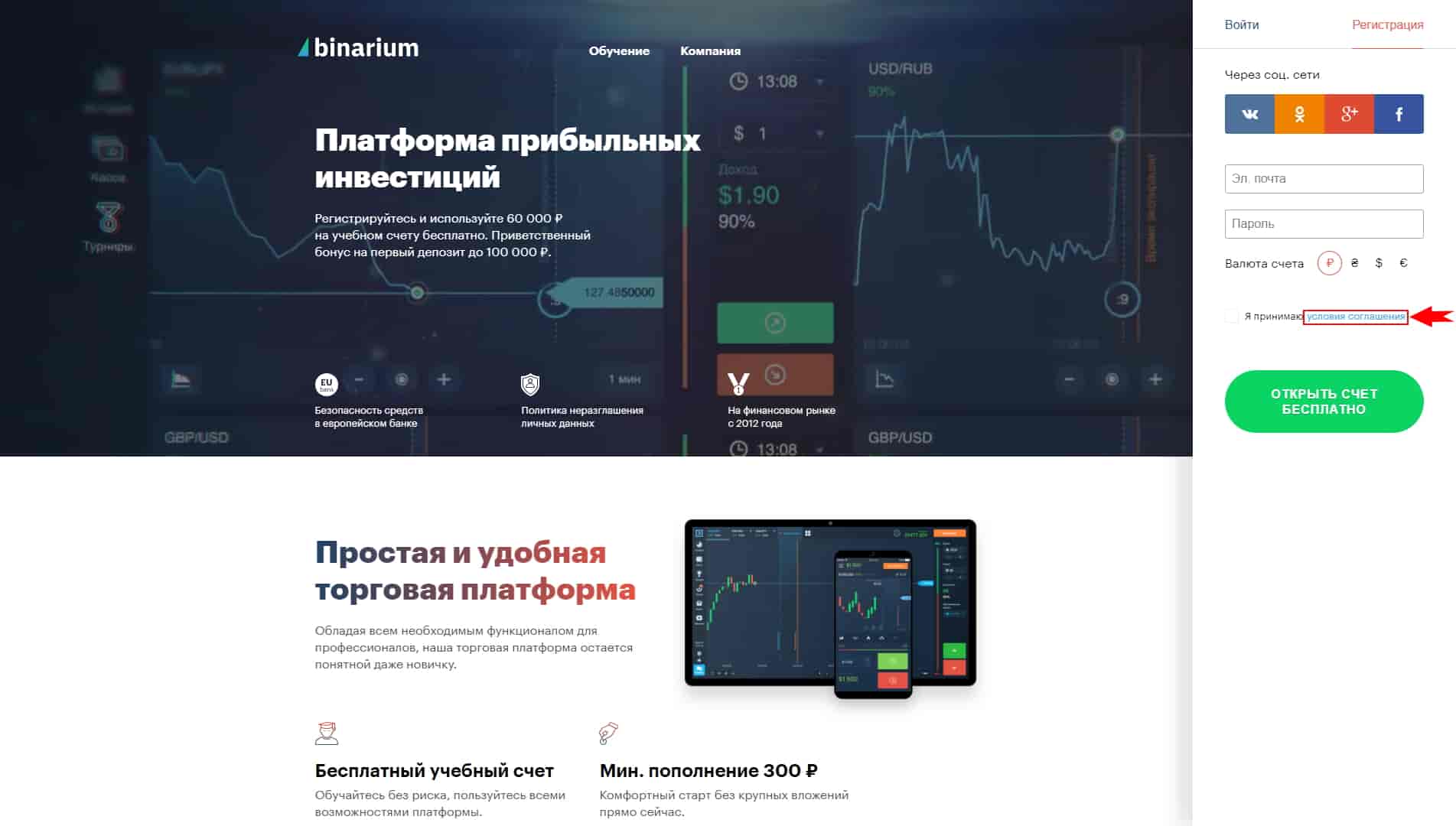 Si tiene alguna pregunta sobre el registro en Binarium y las condiciones de colaboración, le recomendamos leer el acuerdo de usuario. Para obtener esta información, haga clic en el enlace del mismo nombre que se encuentra en la parte inferior de la pantalla: