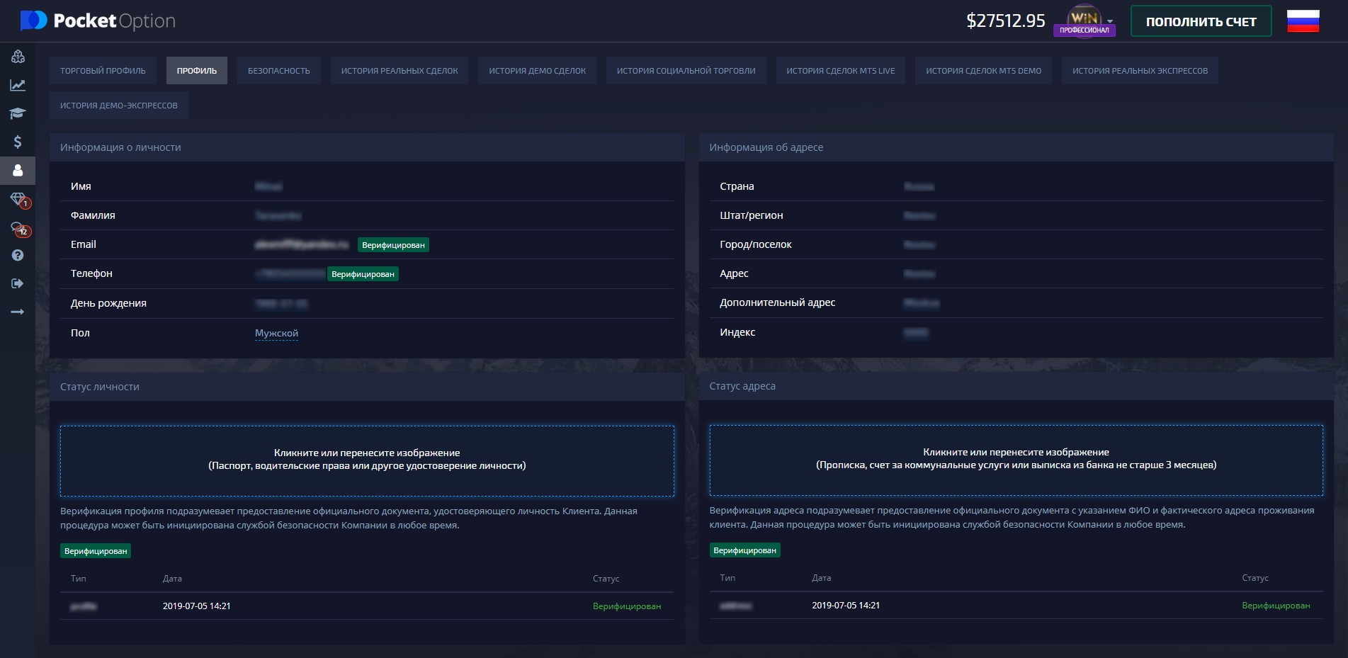 Para saber si la identificación personal se ha completado correctamente, debe abrir las secciones "Estado de identificación" y "Estado de dirección" en su perfil. La verificación de estos datos se realiza sobre la base de páginas escaneadas o fotografiadas de un pasaporte u otro documento de identidad, licencia de conducir. Una vez que se complete la verificación, podrá ver los estados "Verificados" en todas partes: