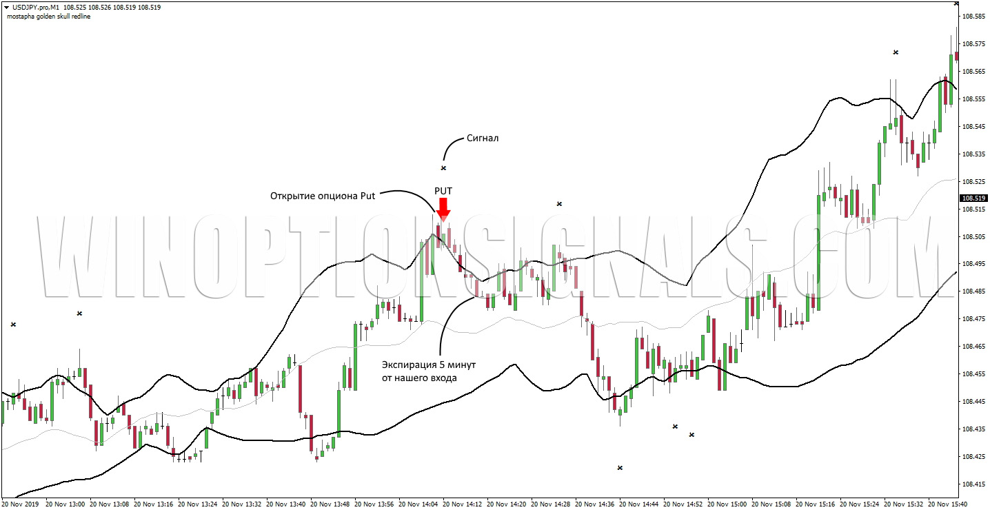 Индикатор для бинарных опционов Golden Skull Redline является сигнальным и совмещает в себе три стандартных индикатора — Moving Average, Moving Average of Oscillator и Bollinger Bands.