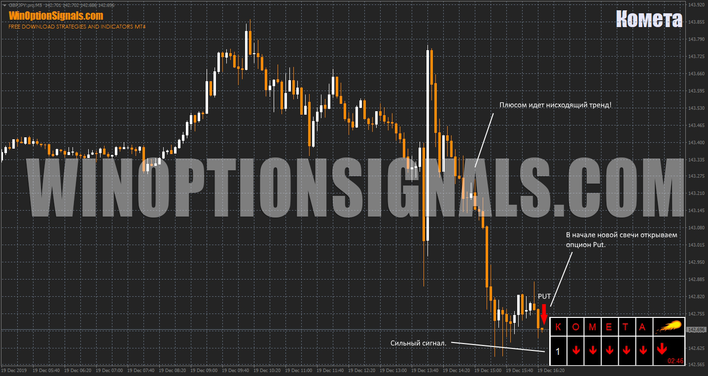Тоже самое имеем на валютной паре GBP/JPY. Сильный сигнал и нисходящий тренд. Открываем опцион «Ниже» или Put: