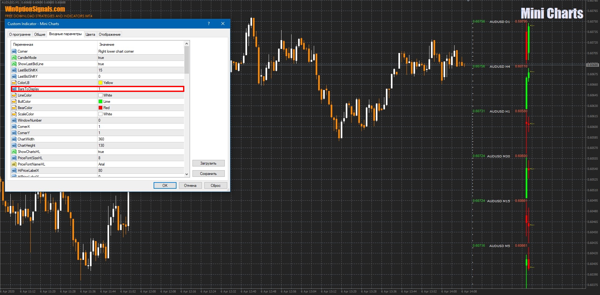 Индикатор для бинарных опционов Mini Charts является информационным и показывает на основном графике мини-графики других тайм фреймов этого же инструмента или любого другого. Данный индикатор полезно использовать, чтобы следить за общим трендом на одном инструменте или видеть сразу несколько разных торговых активов из разных отраслей.