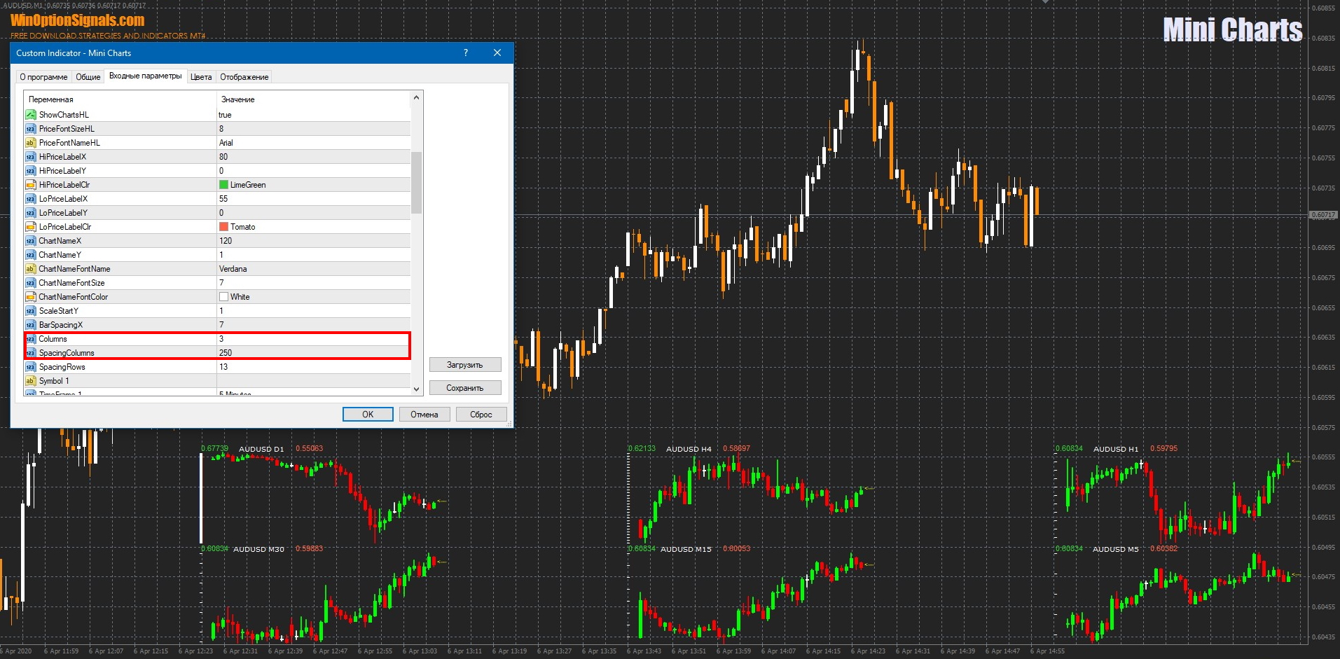 Если с установкой индикатора проблем не должно возникнуть, то с настройками все уже сложнее. Индикатор Mini Charts имеет множество настроек и является очень гибким. Его можно расположить практически в любом месте графика, изменяя размеры как самих свечей, так и расстояние между свечами и графиками. Цвета каждого элемента также можно поменять.