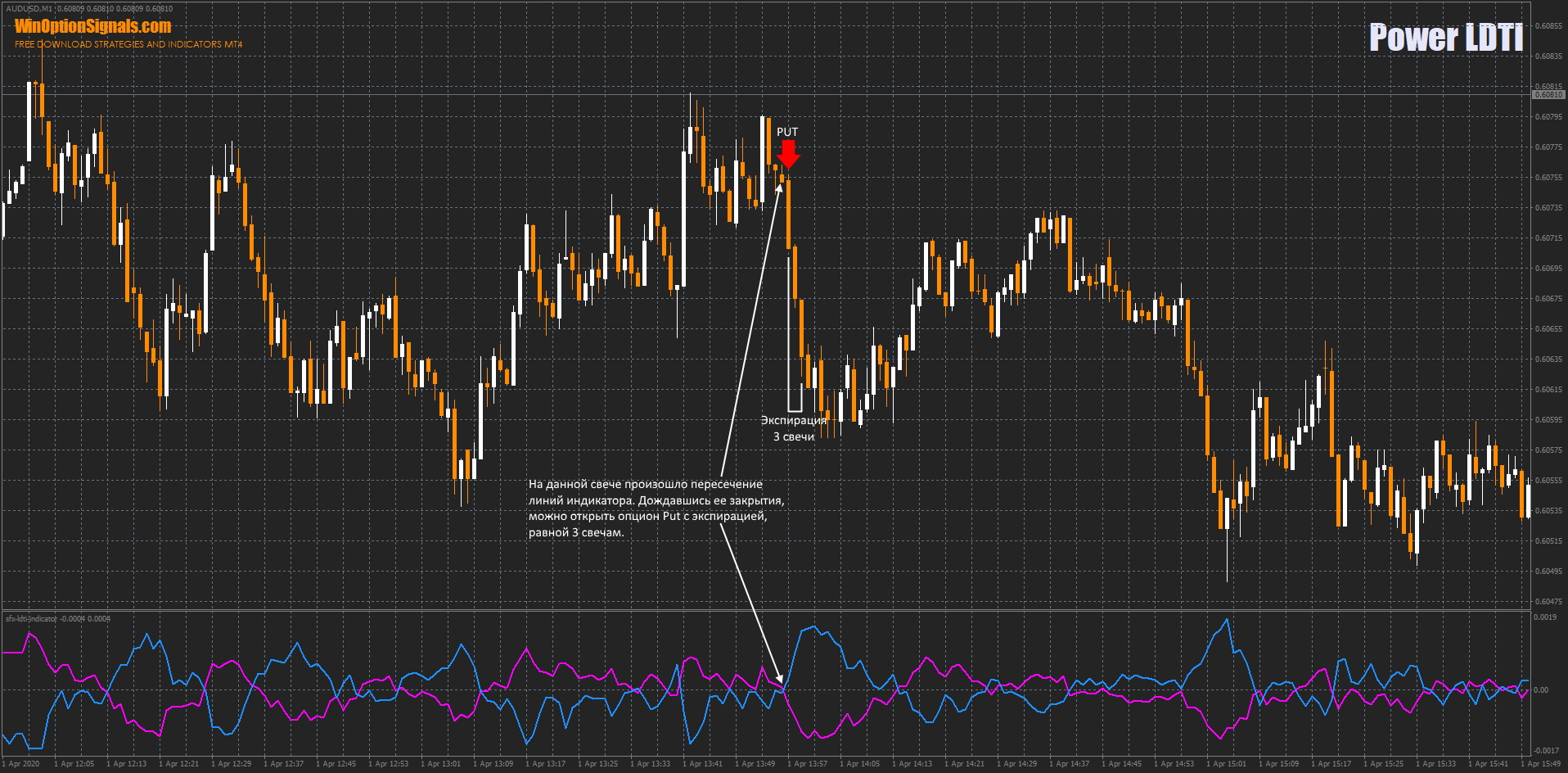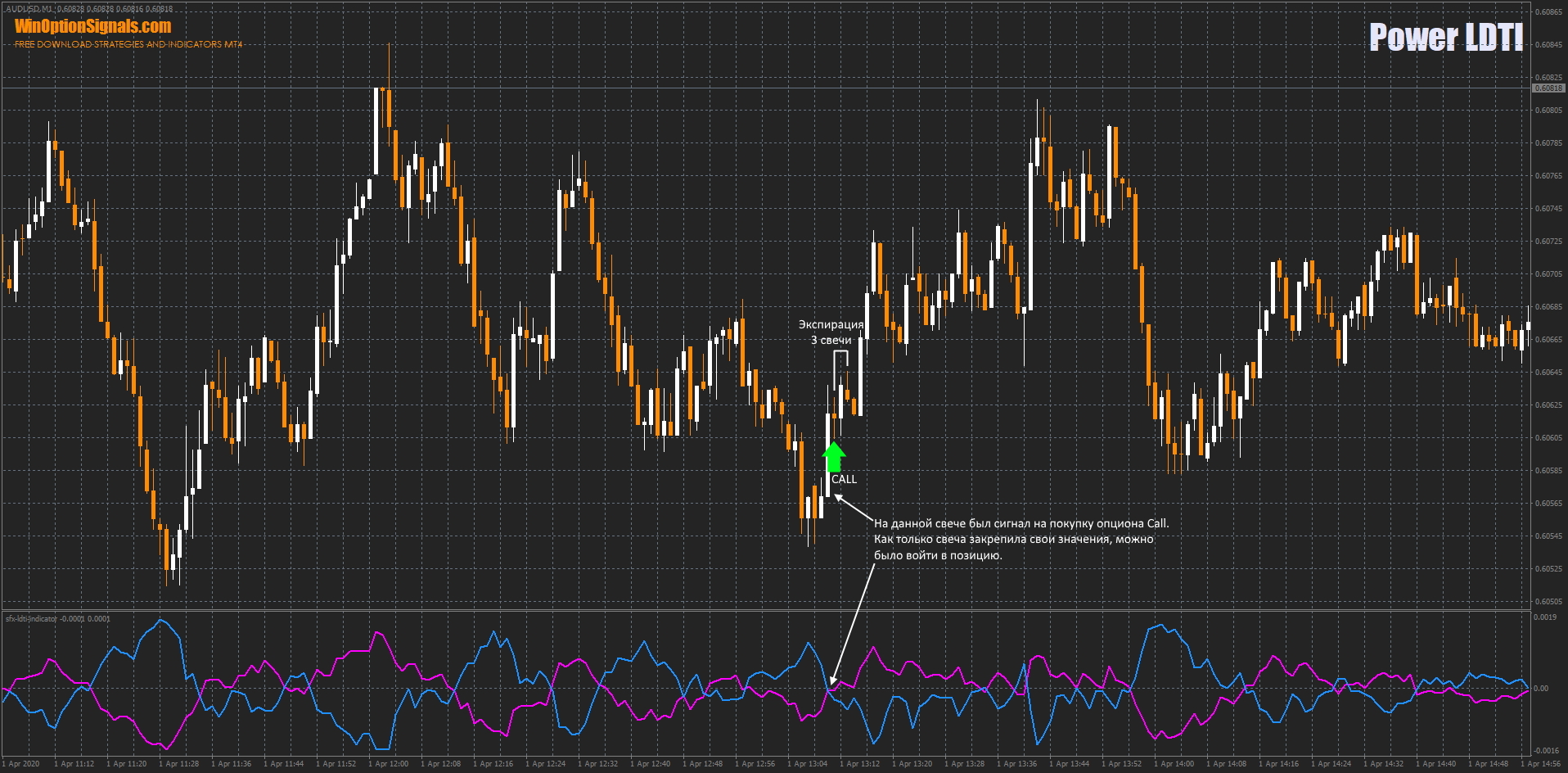 Индикатор для бинарных опционов Power LDTI является перекрестным индикатором, включающим в себя два разных показателя. Использовать данный индикатор можно как на малых тайм фреймах, так и на крупных. Такой индикатор подойдет новичкам, так как правило для открытия сделки с помощью данного индикатора всего одно, но эффективность при этом на довольно высоком уровне.