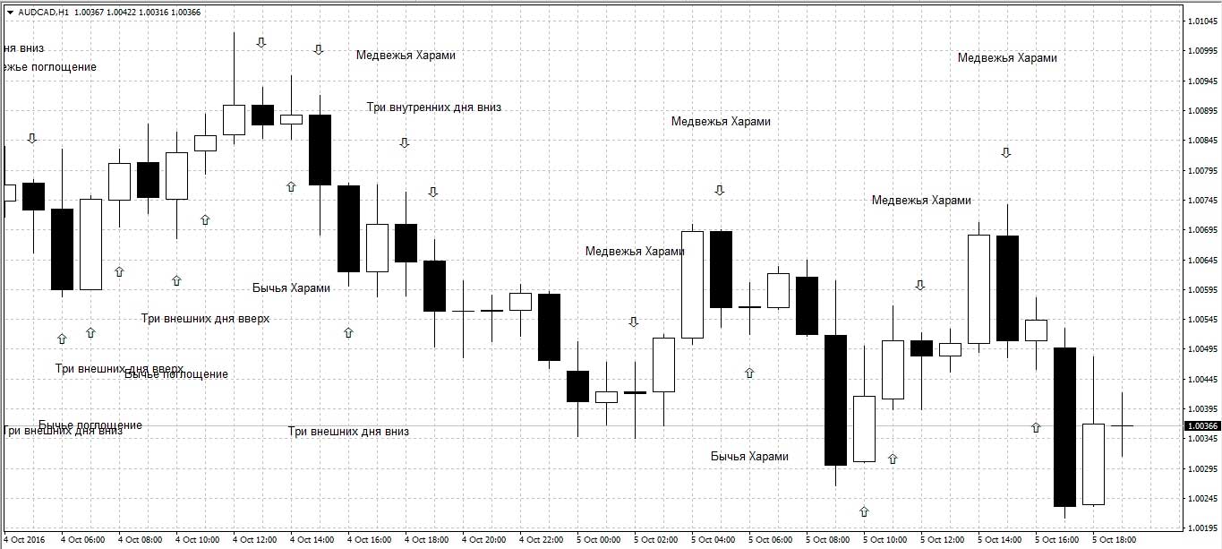 Данный индикатор показывает так же небольшое число комбинаций японских свечей, и отображает названия только при наведении на указатель, однако пользуется большой популярностью и весьма надежен в использовании.