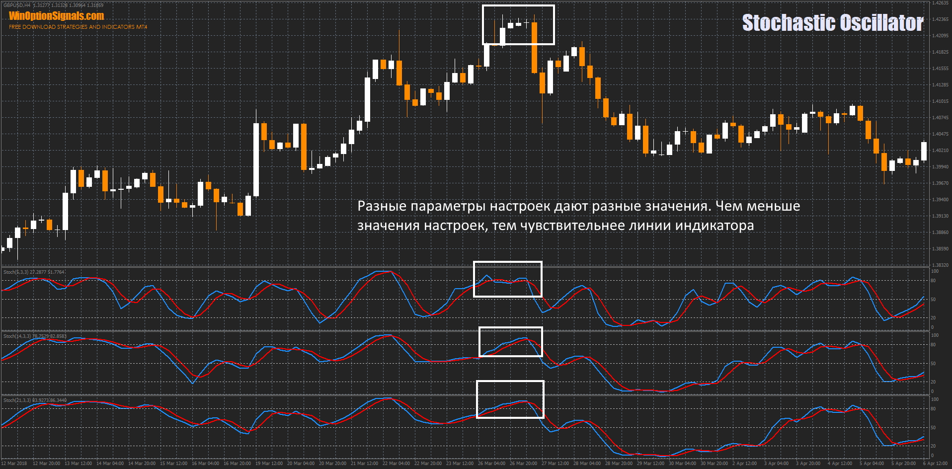 Чем выше тайм фрейм, который нужно проанализировать, тем меньшее значение нужно подбирать для основной линии Стохастика. С большим тайм фреймом индикатор больше запаздывает и маленькие колебания уже считает незначительными.