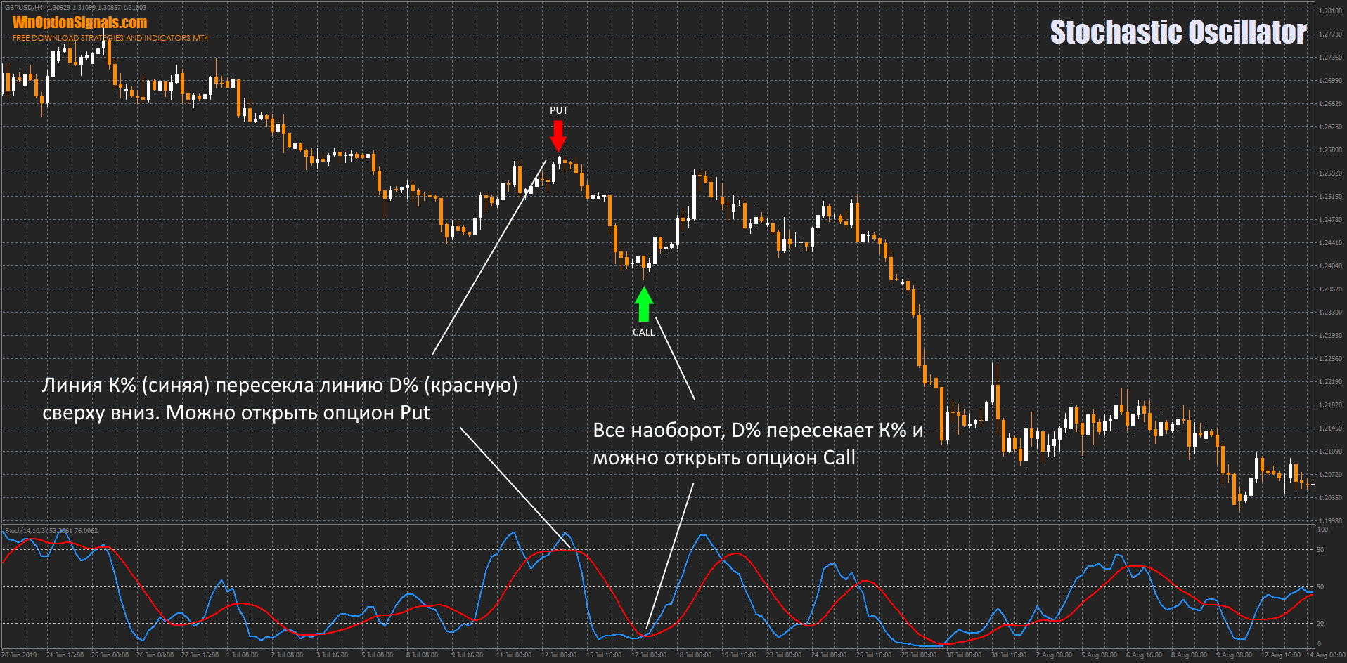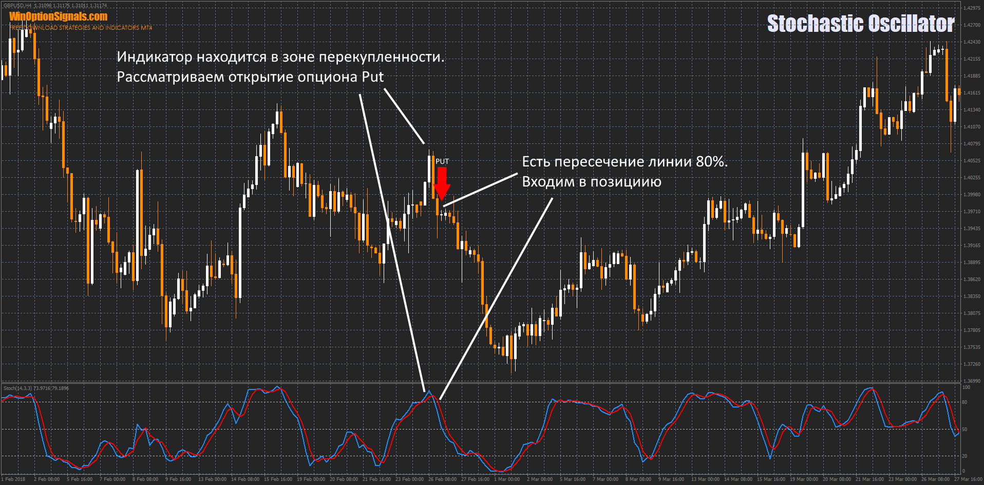 - Разворот индикатора вниз на уровне перекупленности 70-80% рассматривается как сигнал к открытию опциона Put. При пересечении линией %D сверху вниз линии 70-80% получаем дополнительное подтверждение сигнала.