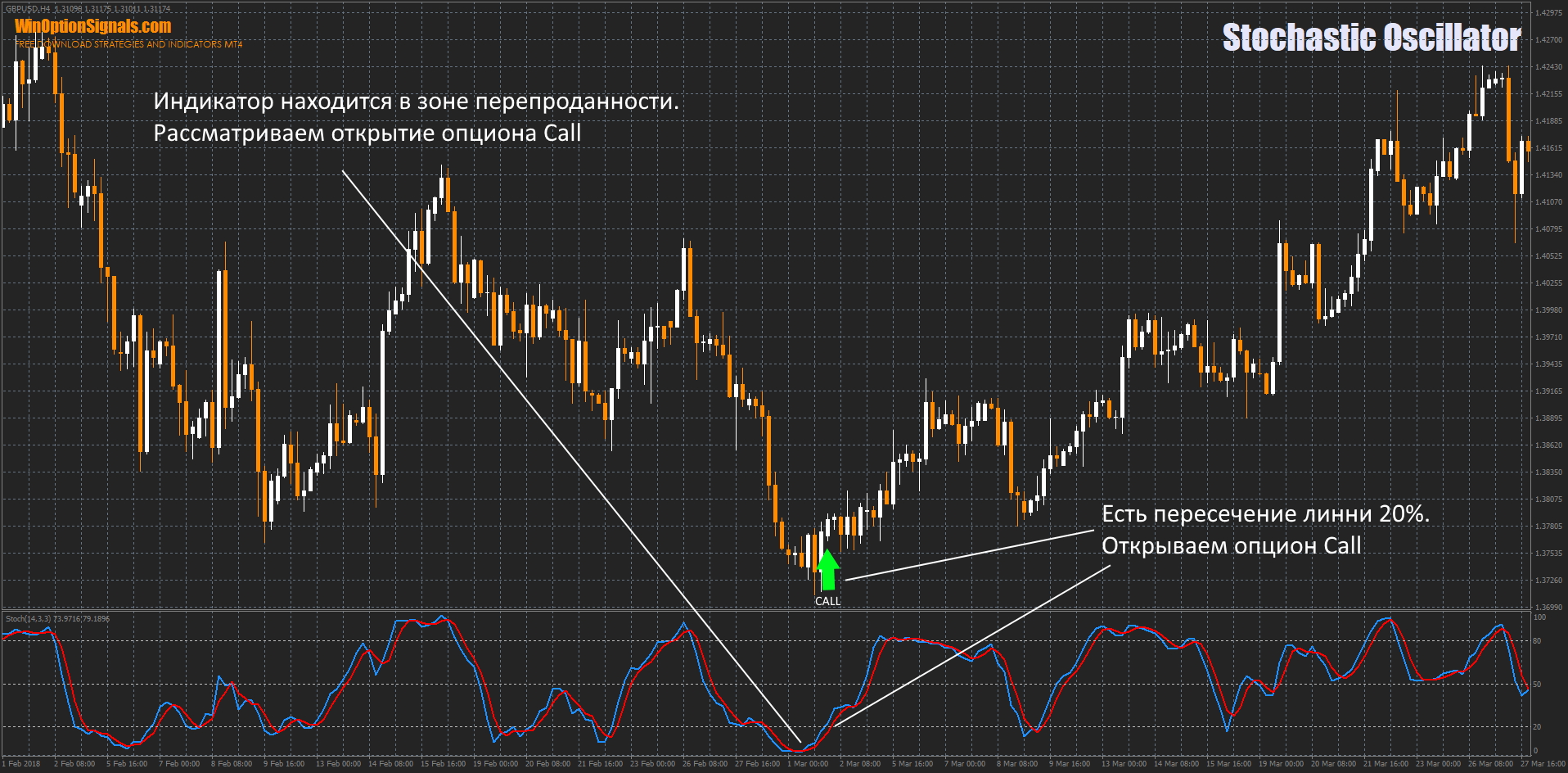 - Разворот индикатора вверх на уровне перепроданности 20-30% рассматривается как сигнал к открытию опциона Call. При пересечении линией %D снизу вверх линии 20-30% получаем дополнительное подтверждение сигнала.