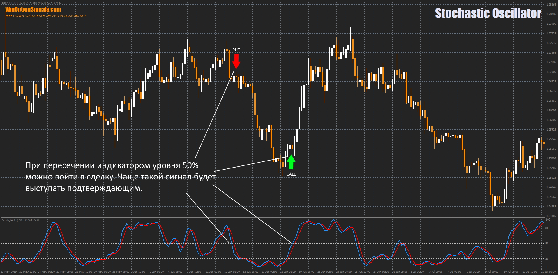 Пробой уровня 50% линиями индикатора Stochastic Oscillator