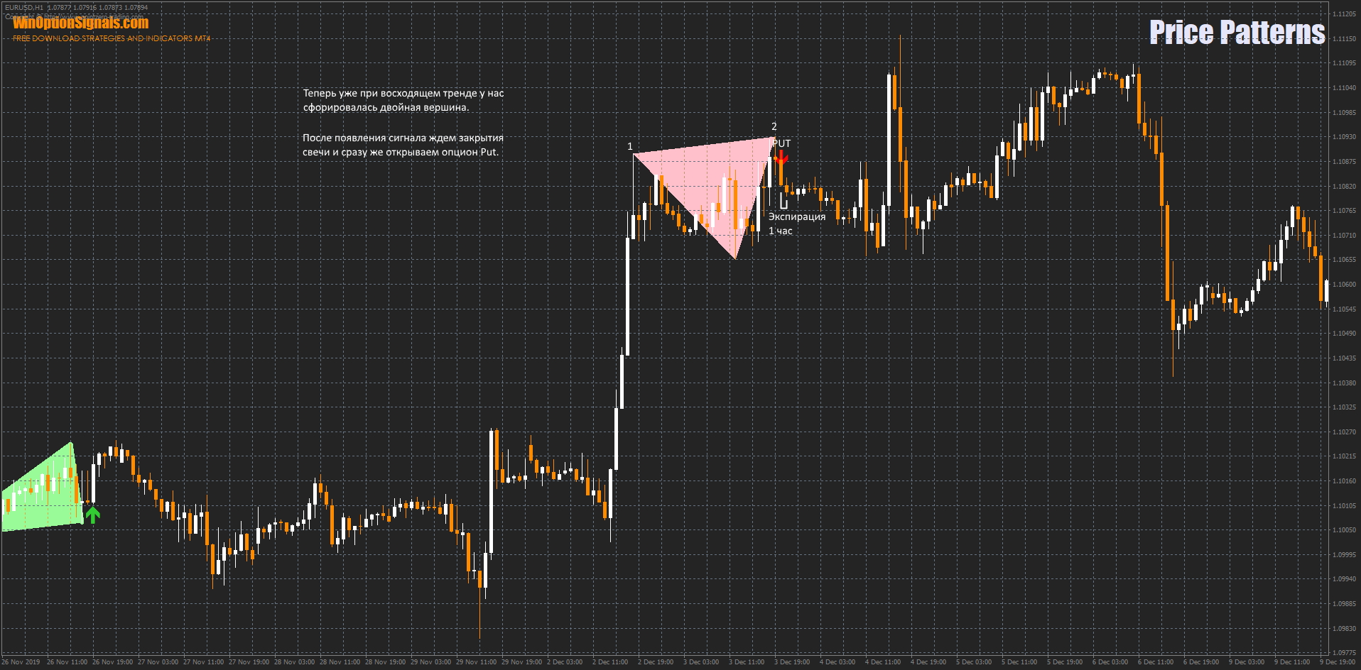 Разбирать примеры будем на валютной паре EUR/USD и тайм фрейме Н1, так как фигуры технического анализа показывают лучшие результаты на больших тайм фреймах. Длина экспирации для опционов – 1 час.