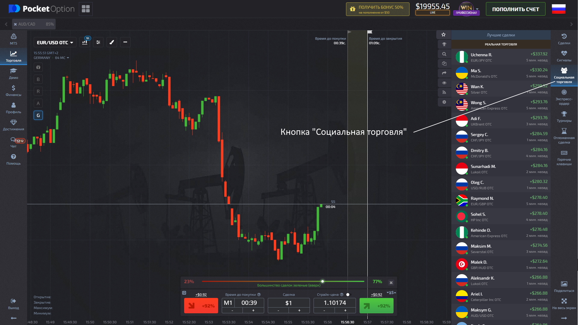 У брокера бинарных опционов Pocket Option социальный трейдинг реализован прям на графике нужного вам актива. Чтобы его активировать, нужно нажать на кнопку «Социальная торговля» в правом боковом меню. Там же можно узнать прибыль каждого трейдера, его место в рейтинге за последние 24 часа, историю совершенных сделок и то, какое количество людей отслеживают его сделки.