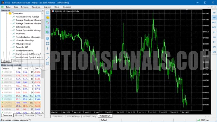 Далее рассмотрим плюсы и минусы, а также функционал терминала MetaTrader 5 у брокера Покет Опшен.