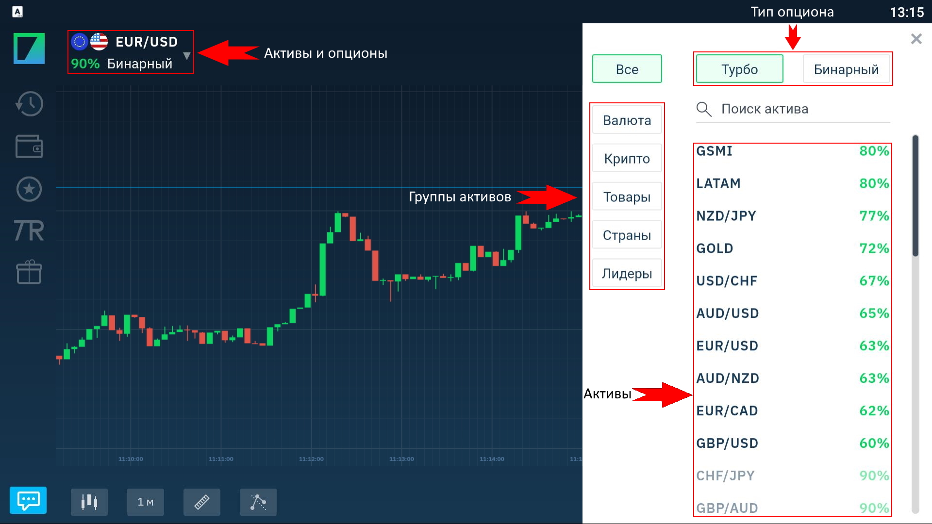 Если говорить о торговле, то в приложении можно выбрать нужный торговый актив и тип опциона, кликнув на наименование инструмента в верхнем левом углу: