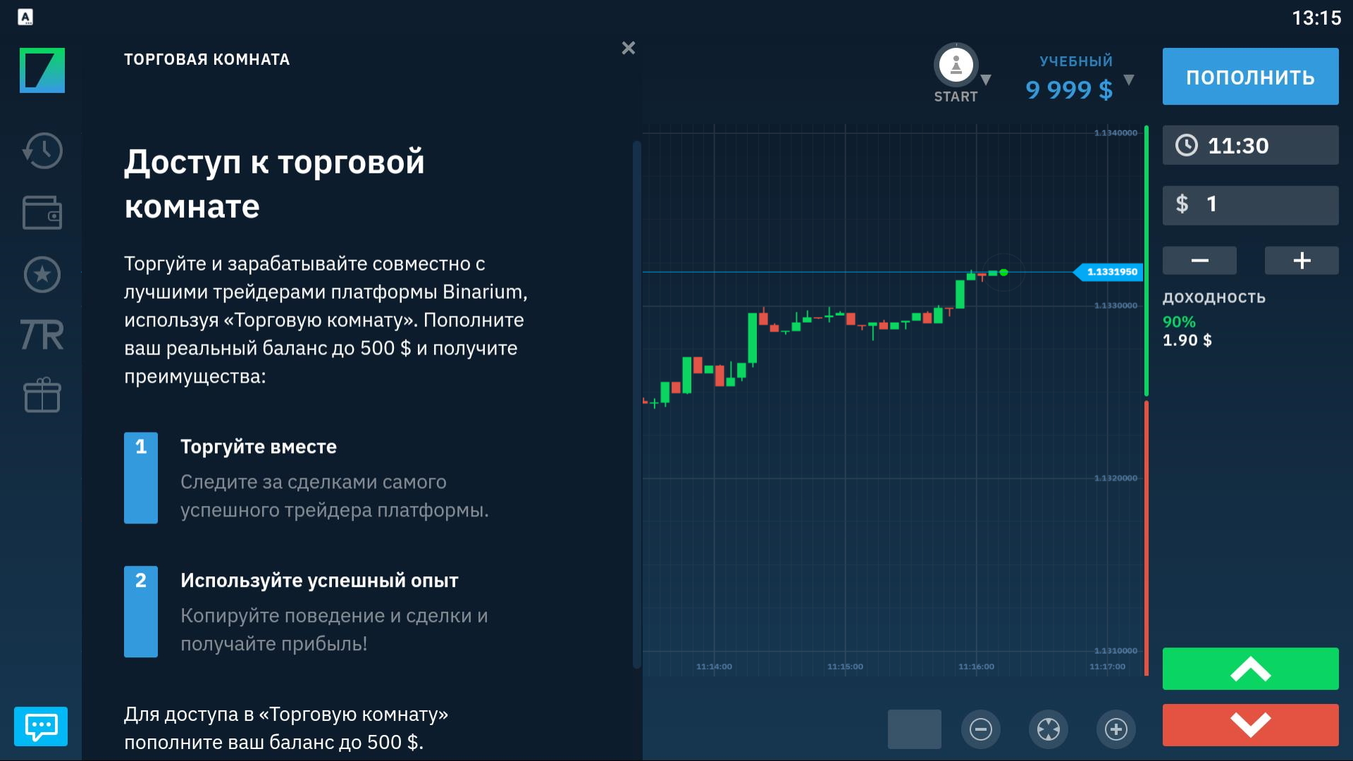 У всех зарегистрированных клиентов компании есть демо-счет, с помощью которого можно опробовать мобильное приложение от брокера Binarium и привыкнуть к торговле с телефона. Торговля с демо-счета является полноценной и каждый может опробовать торговлю с любыми видами бинарных опционов и на любых торговых активах.