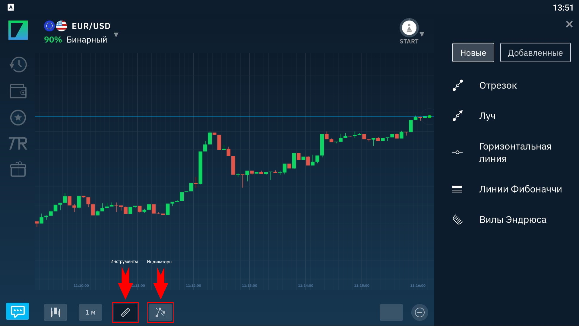 Одним из преимуществ мобильного приложения брокера Binarium является наличие графических инструментов и индикаторов, которые позволяют проводить графический анализ: