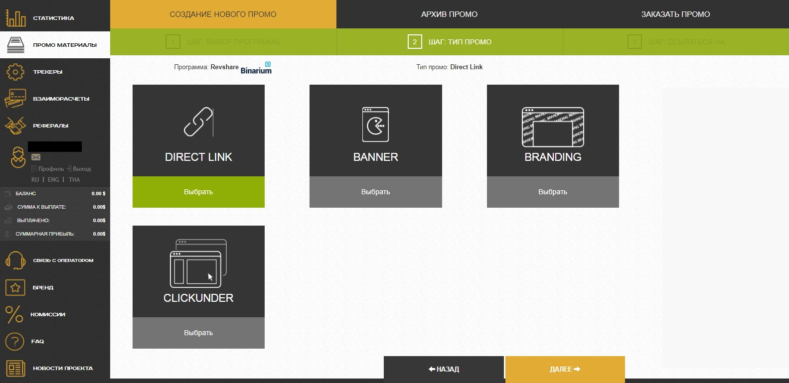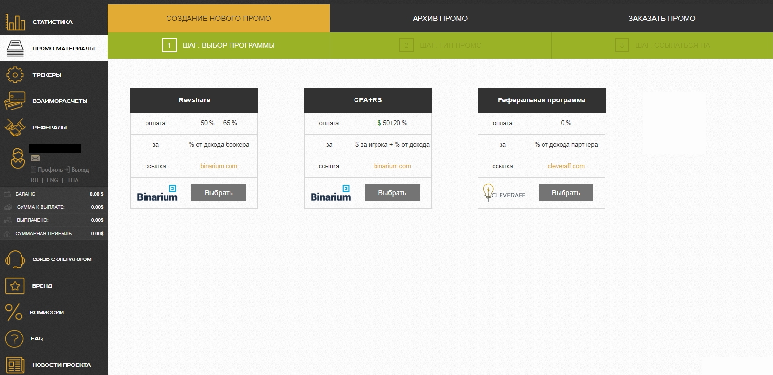 Материалы и их настройки находятся в разделе «Промо материалы» и первое, что необходимо будет сделать, это выбрать программу для вознаграждений: