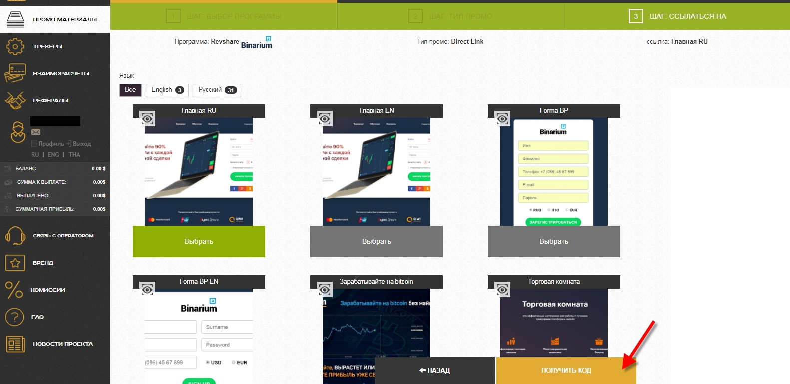 И последнее, что останется сделать, это выбрать понравившийся промо материал и нажать на кнопку «Получить код»: