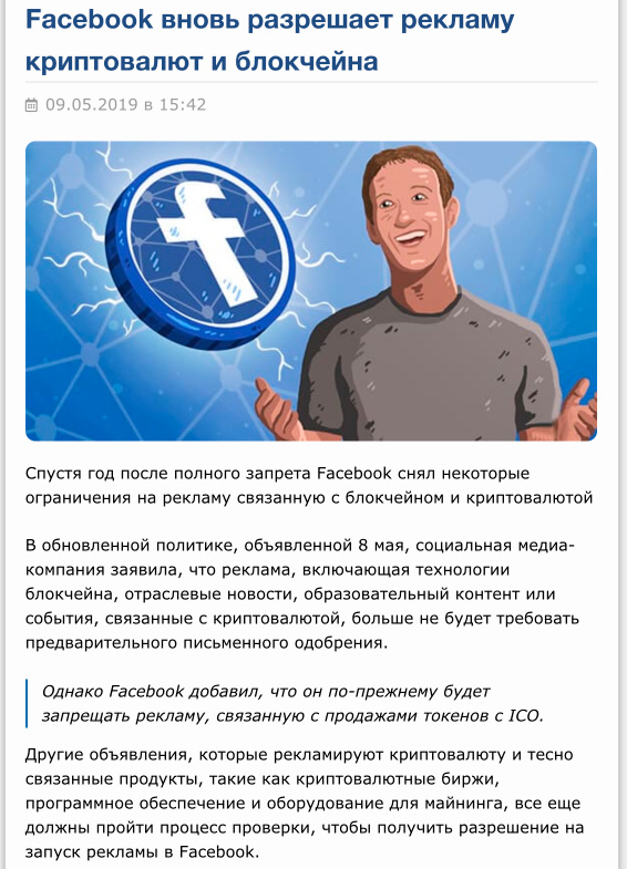 После чего свою эстафету перехватили и СМИ, в частности самая крупная социальная сеть Facebook объявила о возобновлении возможности рекламы криптовалют и блокчейн технологий на своей рекламной платформе