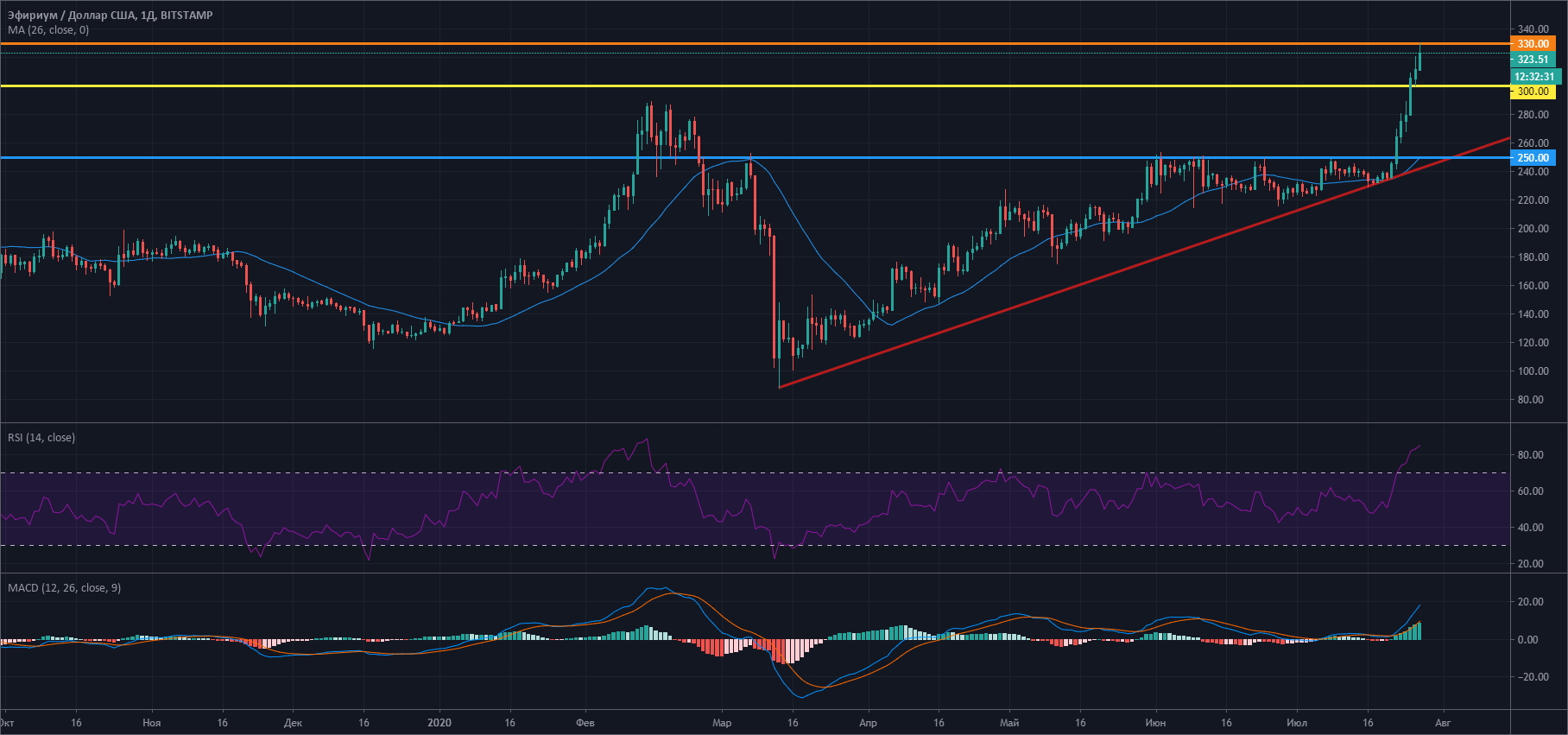 Эфириум впервые за 2020 год торговался выше $300. Рост криптовалюты произошел после того, как ETH пробил сопротивление на уровне $250, выйдя тем самым из диапазона. Помимо других альткоинов, которые росли в первые две недели июля, Ethereum сильно коррелировал с ценой BTC.