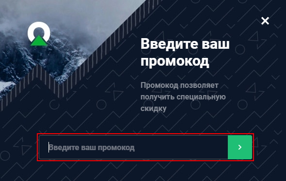 В выпадающем меню надо будет выбрать вкладку «Промокод» и в открывшемся окне будет поле для ввода купона: