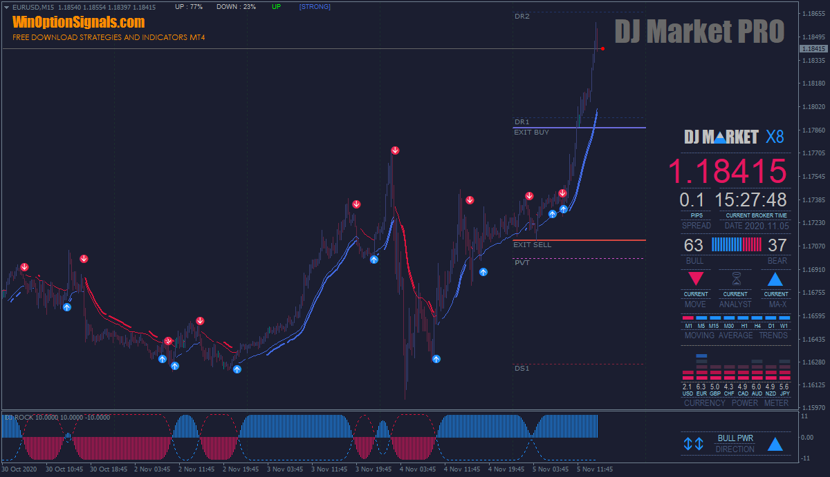 Стратегия для бинарных опционов DJ Market PRO является скальперской и предусматривает торговлю на 15-минутном графике, хотя может без проблем применяться и на М1 или М5. Также DJ Market PRO Trading System содержит целых шесть разных шаблонов для агрессивных и консервативных стилей торговли.