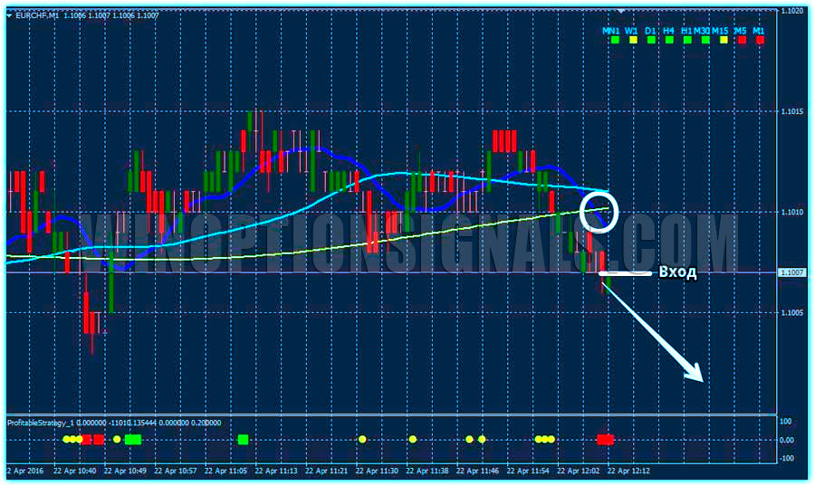 - Синяя линия устремилась вниз, и на пути своего падение пересекла желтую линию. Также подтверждением этого сигнала служит момент, когда пересекаются линии синего и голубого цвета, но при одном условии: их стартовая позиция – расположение под желтой линией.