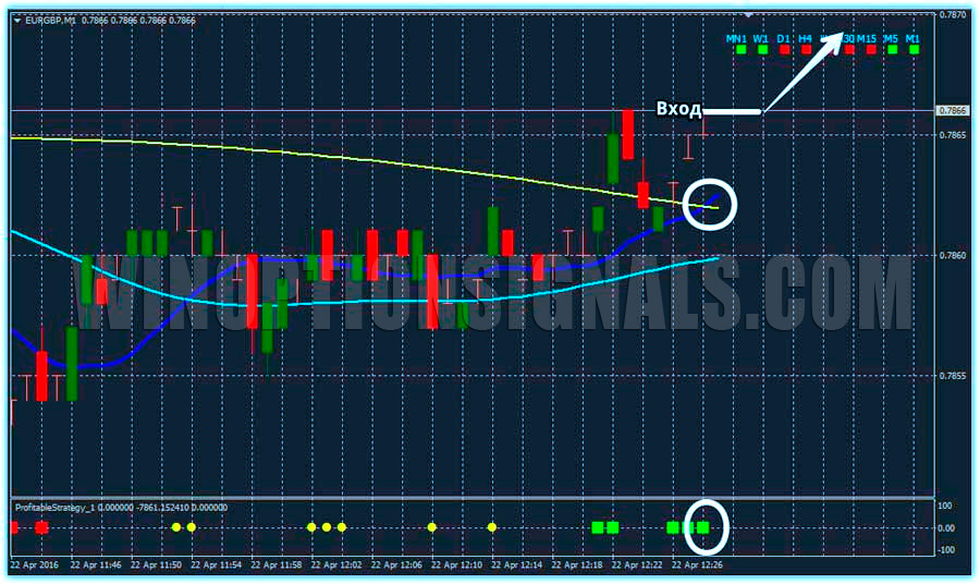 Если обратиться к графику, то можно увидеть, что предлагаемая стратегия основана на следующих индикаторах: