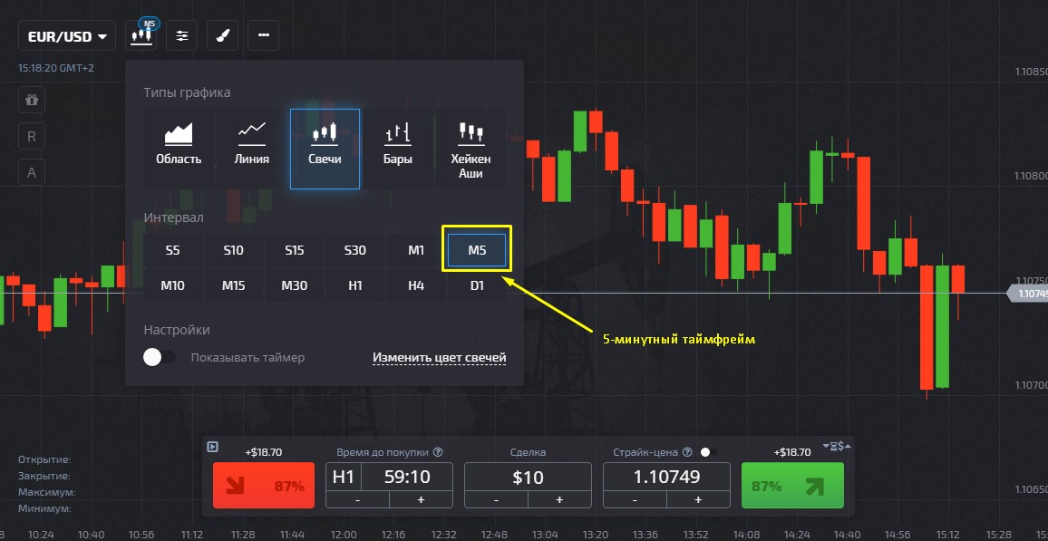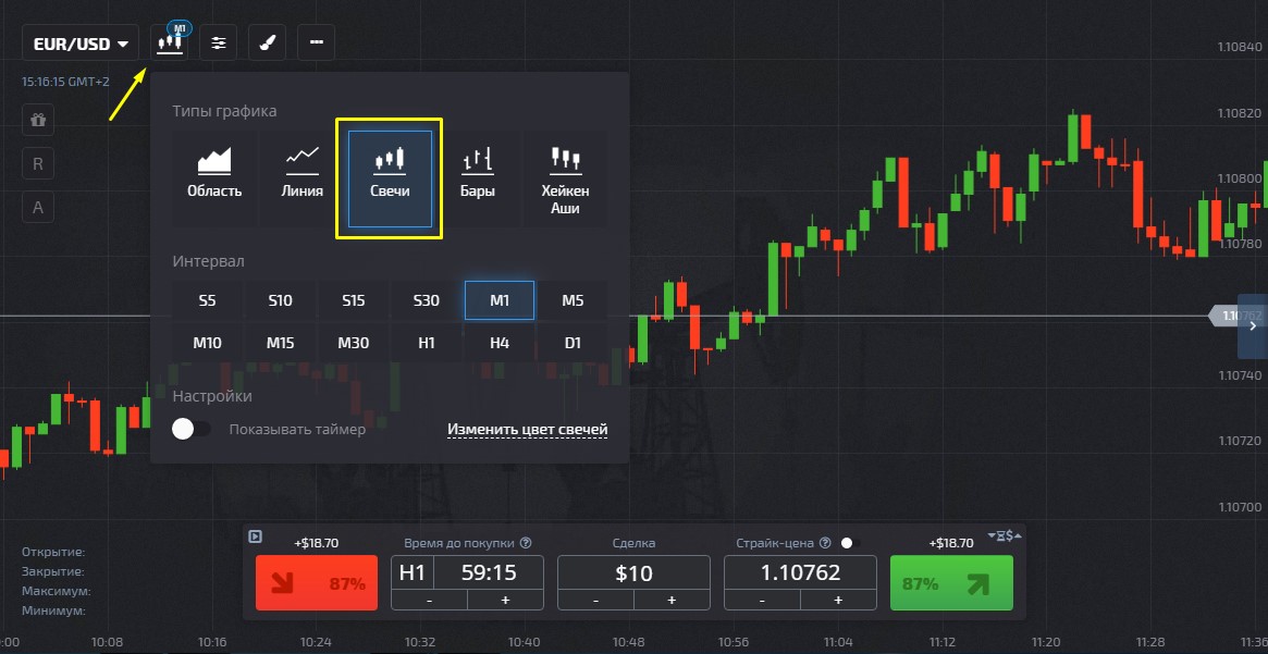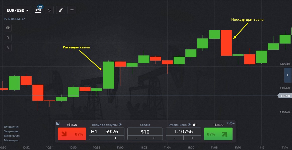 Сверху и снизу каждой свечи появляются отрезки (или тени), которые показывают максимальную и минимальную цену соответственно, достигнутую торговым активом в процессе формирования одного такого прямоугольника. По-другому данный период (или время, затраченное для образования свечи) называется таймреймом.Последний показатель можно настраивать в терминале Покетопшн. Допустим, трейдер установил таймфрейм H1. Это означает, что свеча на графике будет формироваться в течение одного часа.