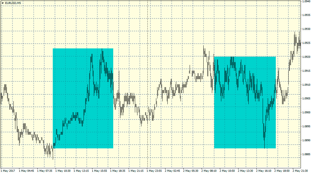 Для определения времени активных торгов советуется прибегнуть к помощи индикатора торговых сессий. Если планируется торговать валютной парой EURUSD, то лучше всего делать это в период лондонской сессии (10-19 часов по Москве).
