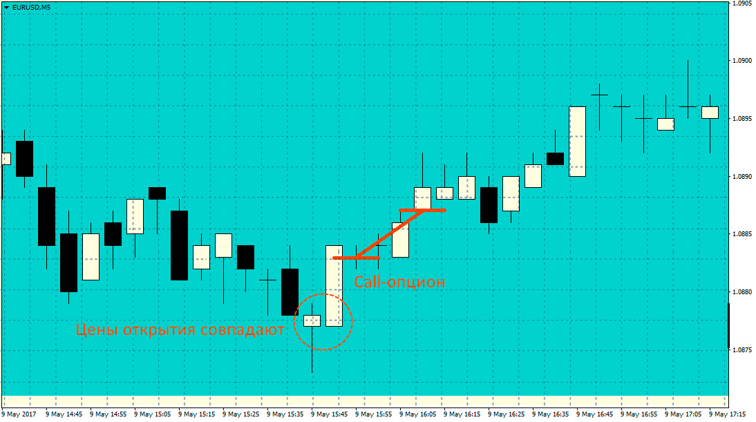 Первое, что должен сделать трейдер – отыскать на графике свечу с телом небольшого размера и относительно большой тенью. Также под эту категорию попадают доджи, а также пин-бары. Следующая образованная свеча должна иметь большое тело, которым она будет перекрывать короткое тело бара, расположенного перед ней. На графике может наблюдаться равенство цен открытия, что является довольно сильным сигналом к развороту. В момент открытия третьей свечи приобретается опцион.