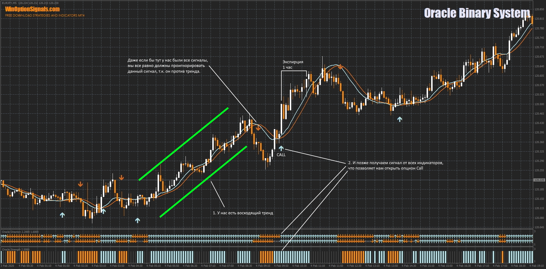 - Индикатор Oracle Strength должен показывать сильное движение, то есть должен быть сформирован белый толстый столбец диаграммы.