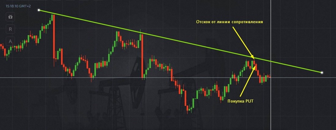Ордера на опционы Put нужно выставлять при обратной ситуации. Сделки в этом случае открывают, если при нисходящем тренде график цены отскакивает от линии сопротивления и продолжает двигаться вниз.