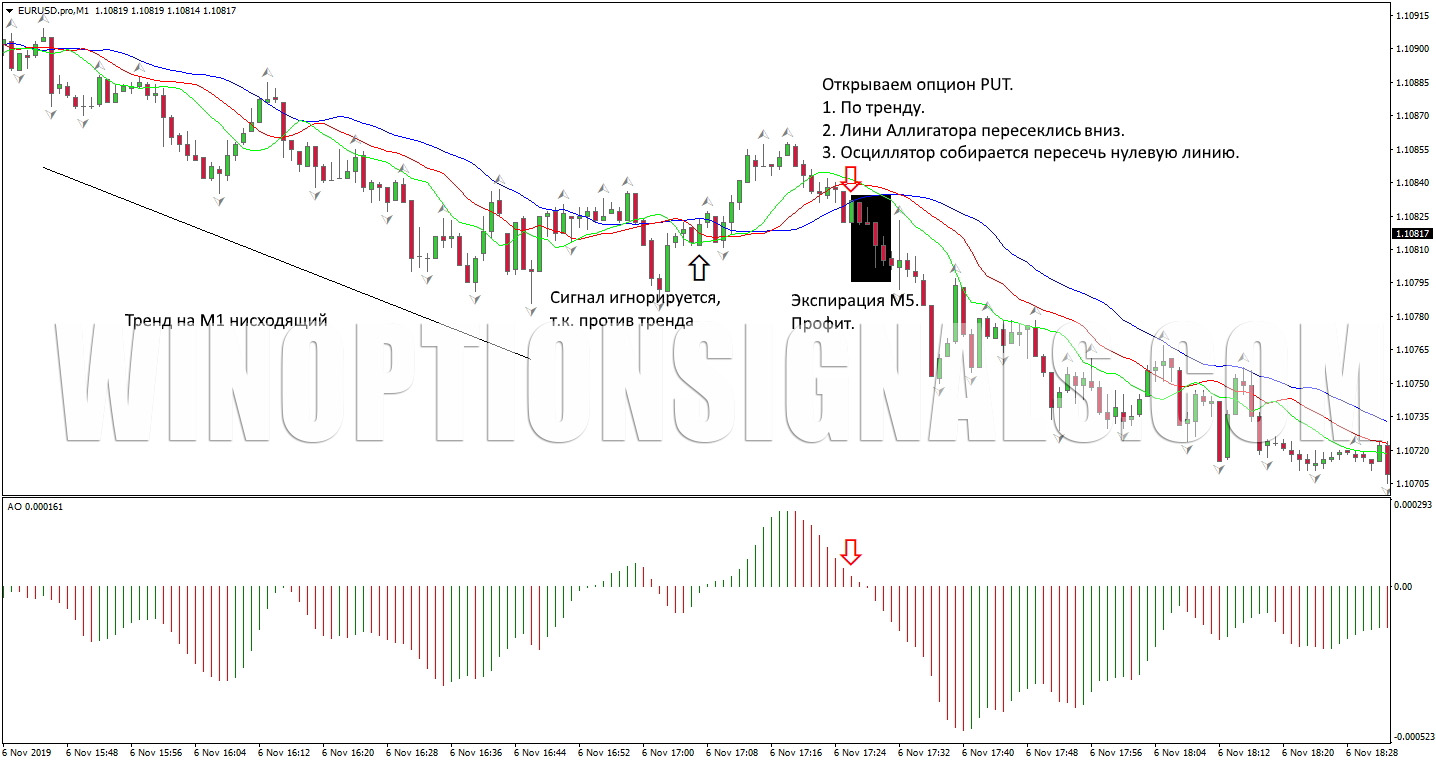 На рисунке ниже видим нисходящий тренд на М1. Линии Аллигатора пересеклись вниз, осциллятор готовится пересечь нулевую линию, а позже и предыдущий Фрактал был обновлен.