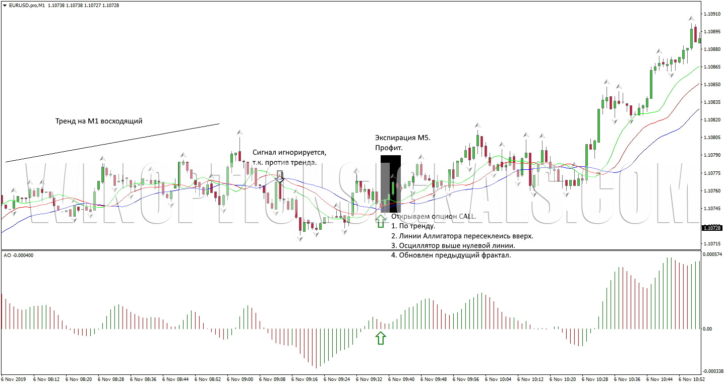 На рисунке ниже видим восходящий тренд на М1. Линии Аллигатора пересеклись вверх, осциллятор находится выше нулевой линии, и предыдущий Фрактал был обновлен.