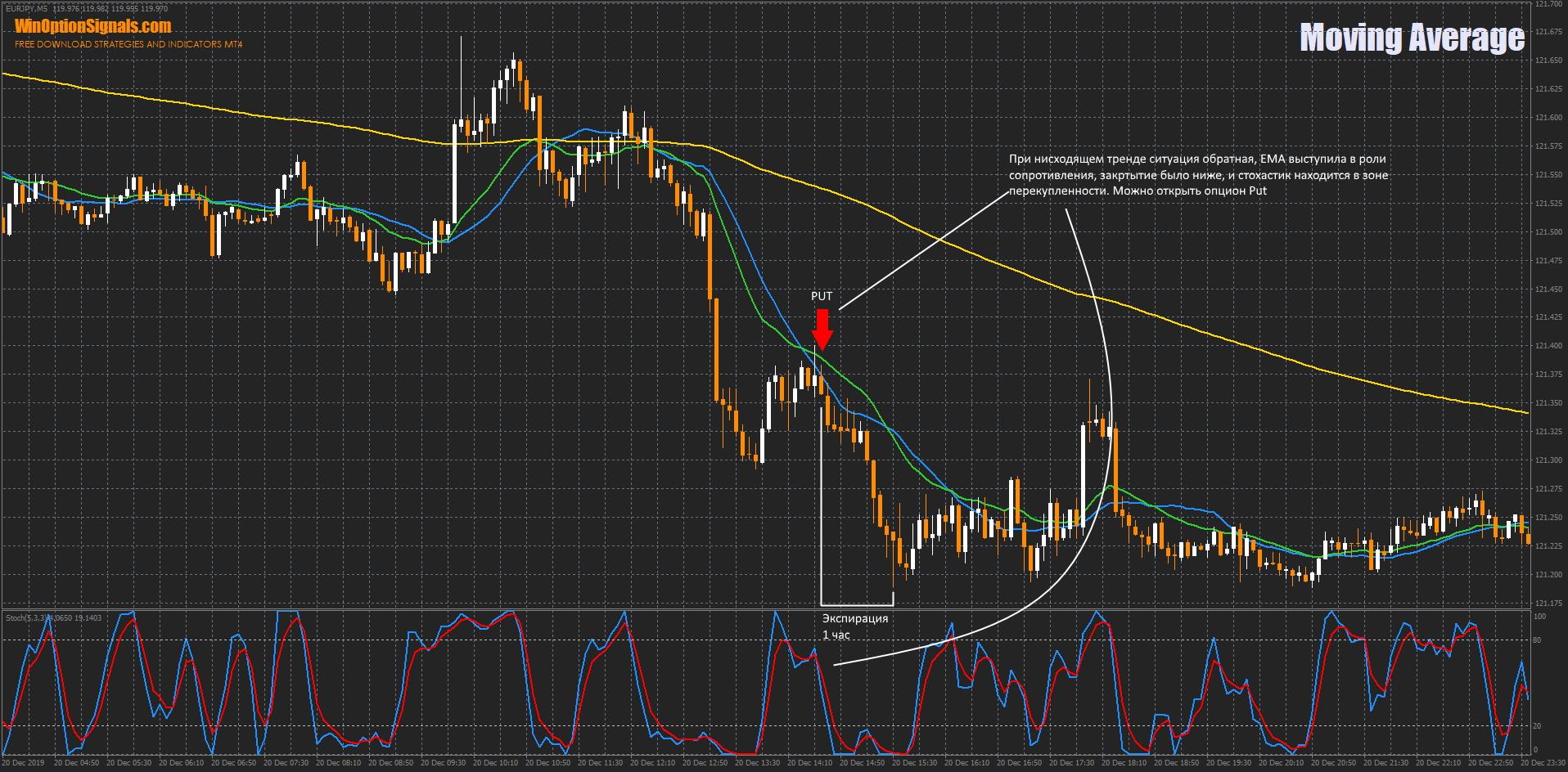 Аналогичная ситуация при нисходящем тренде. Есть показания Стохастика и есть закрытие ниже EMA. Открываем опцион Put.