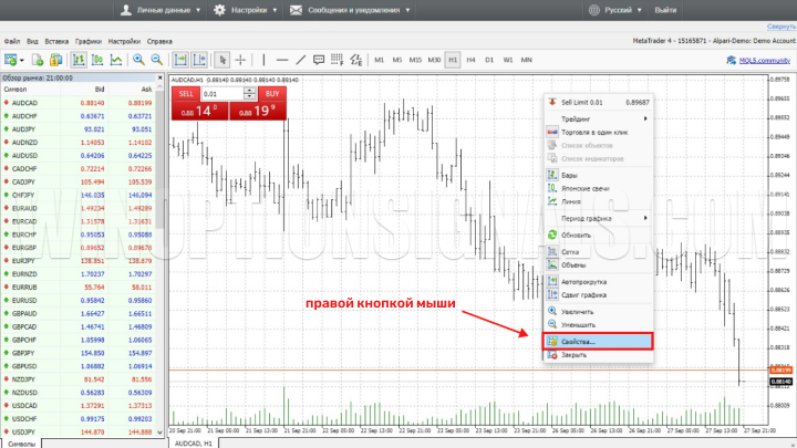 После нажатия правой кнопкой мыши на графике появляется меню с быстрым доступом к некоторым функциям: