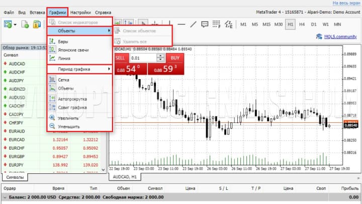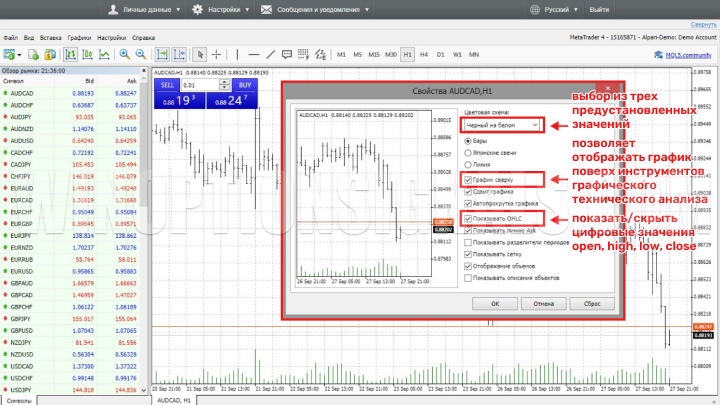 Данное меню используется в основном для повышения удобства чтения графика. Для этих целей можно изменять формат цветового отображения, выбрав один из трех доступных вариантов. После установки галочки напротив строки «График сверху» график отображается сверху выведенных инструментов анализа. Также через это меню выставляются или убираются линии ask, high и low, open и close, и суточные разделители периодов. Кроме того, здесь можно включить функцию отображения объектов и многое другое: