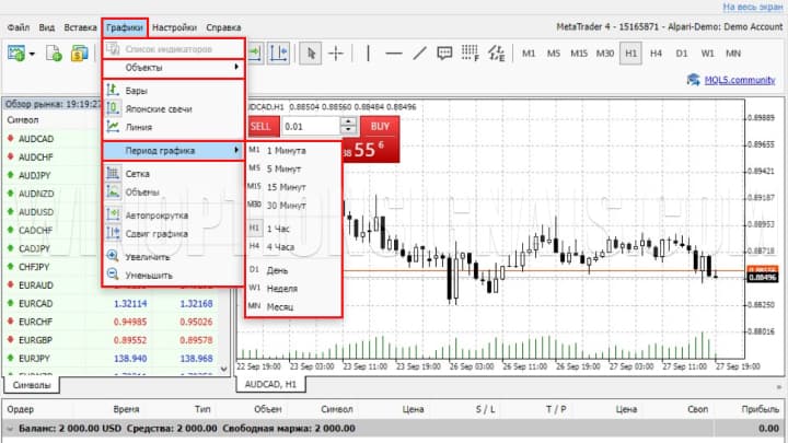 - Изменить таймфрейм. Веб-версия, как и программный MT4, поддерживает разные временные интервалы — от минуты и до одного месяца.